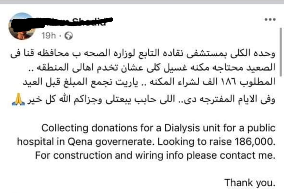 حساب علي فيس بوك يطلب تبرعات لوحدة الغسيل الكلوي بمستشفي نقادة المركزي.. وصحة قنا: سنتخذ الاجراءات القانونية